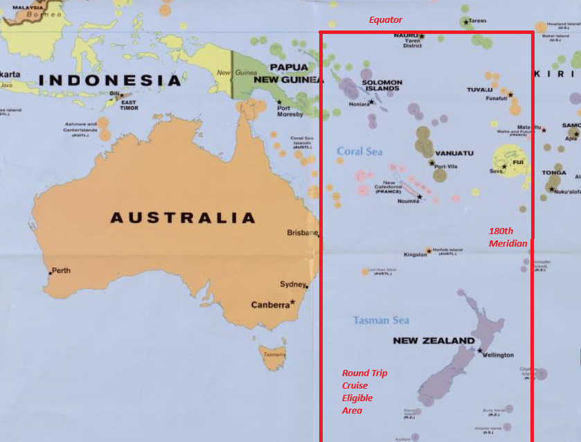 - The voyage only visits ports in countries no part of which lie further north than the equator; no further east that the 180th meridian (Fiji); and not to the west of Australia. (therefore cruises incorporating Indonesia and Papua New Guinea are not eligible)