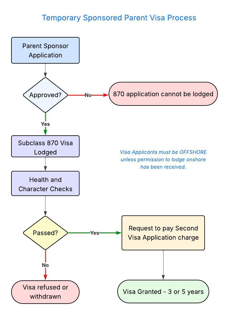 In order to apply for a Subclass 870 Temporary Sponsored Parent Visa, there must be an Approved Sponsorship already in place. This means that the Parent (Family) Sponsorship must be lodged first and approved, before 870 visa applications can be lodged.Â